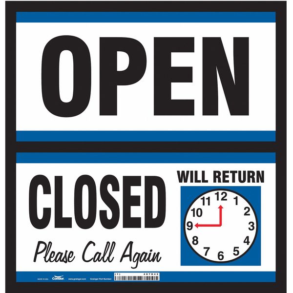 SKU G6557140Categories SafetyDescription Admittance Sign, Rectangle, Number of Printed Sides 2, English, Sign Legend Open/Closed Please Call Again Will Return, Sign Legend Style TextgraingerSKU: 487D42, mscSKU: , zoro_no: G6557140, mongo_id: 65bbe76c3aaddbd5a9093858