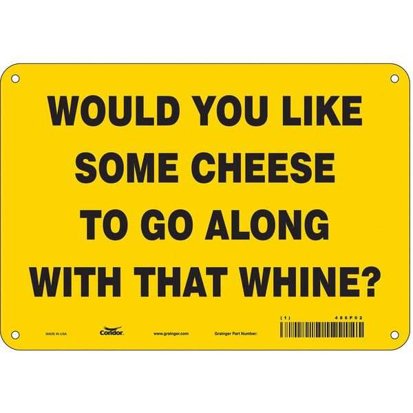 SKU G6299568Categories SafetyDescription Safety Sign, Vertical Rectangle, Number of Printed Sides 1, English, Sign Format Other Format, Sign Legend Would You Like Some Cheese To Go Along With That Whine?, Sign Legend Background Color Yellow, Sign Legend Style TextgraingerSKU: 486P02, mscSKU: , zoro_no: G6299568, mongo_id: 65bbe76c3aaddbd5a90937d3