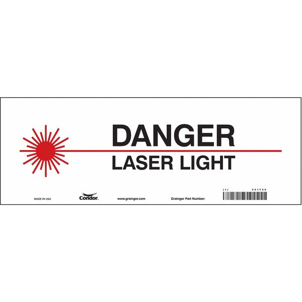 SKU G5198501Categories SafetyDescription Safety Sign, Vertical Rectangle, Number of Printed Sides 1, English, Sign Format Other Format, Sign Legend Danger Laser Light, Sign Legend Background Color White, Sign Legend Style Symbol and Text Safety Sign, 5 in H, 14 in W, Vinyl, Vertical Rectangle, 451T20