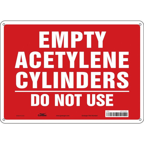 SKU G5058571Categories SafetyDescription Safety Sign, Horizontal Rectangle, Number of Printed Sides 1, English, Sign Format Other Format, Sign Legend Empty Acetylene Cylinders Do Not Use, Sign Legend Background Color Red, Sign Legend Style Text Safety Sign, 10 in Height, 14 in Width, Aluminum, Horizontal Rectangle, English, 471L31