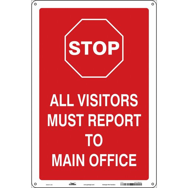 SKU G5803590Categories SafetyDescription Traffic Sign, Vertical Rectangle, Number of Printed Sides 1, English, Sign Legend Stop All Visitors Must Report To Main Office, Sign Legend Background Color Red, Sign Legend Style Text Traffic Sign, 18 in H, 12 in W, Aluminum, Vertical Rectangle, English, 477R41