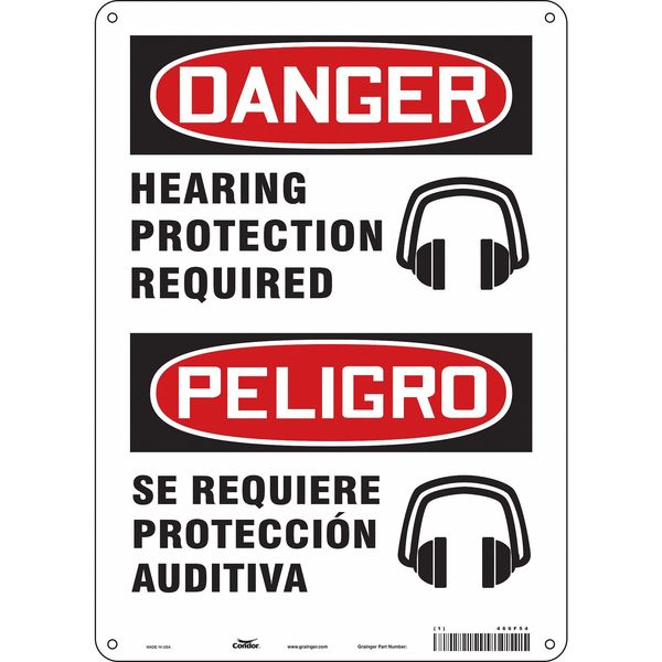 SKU G5070718Categories SafetyDescription Safety Sign, Vertical Rectangle, Number of Printed Sides 1, English, Spanish, Sign Format Traditional OSHA, Sign Legend Hearing Protection Required/Se Requiere Proteccion Auditiva, Sign Legend Background Color White, Sign Legend Style Symbol and Text Safety Sign, 14 in Height, 10 in Width, Aluminum, Vertical Rectangle, English, Spanish, 466F54