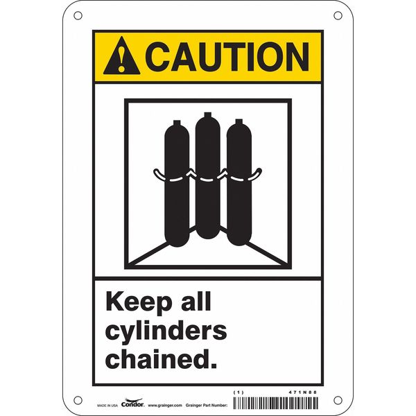 SKU G5617853Categories SafetyDescription Safety Sign, Horizontal Rectangle, Number of Printed Sides 1, English, Sign Format ANSI/OSHA Format, Sign Legend Keep All Cylinders Chained., Sign Legend Background Color White, Sign Legend Style Symbol and Text Safety Sign, 10 in Height, 7 in Width, Aluminum, Horizontal Rectangle, English, 471N88