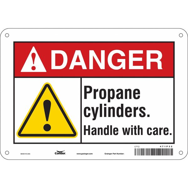 SKU G5622537Categories SafetyDescription Safety Sign, Vertical Rectangle, Number of Printed Sides 1, English, Sign Format ANSI/OSHA Format, Sign Legend Propane Cylinders. Handle With Care., Sign Legend Background Color White, Sign Legend Style Symbol and Text Safety Sign, 7 in Height, 10 in Width, Aluminum, Vertical Rectangle, English, 471P32