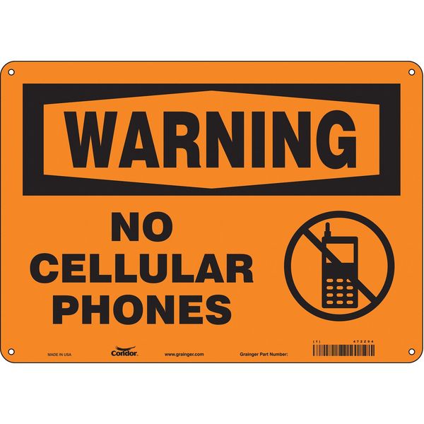 SKU G5580528Categories SafetyDescription Safety Sign, Horizontal Rectangle, Number of Printed Sides 1, English, Sign Format Traditional OSHA, Sign Legend No Cellular Phones, Sign Legend Background Color Orange, Sign Legend Style Symbol and Text Safety Sign, 10 in Height, 14 in Width, Aluminum, Horizontal Rectangle, English, 472Z94