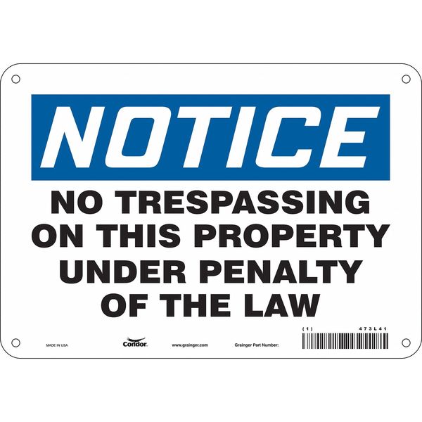 SKU G5611912Categories SafetyDescription Safety Sign, Vertical Rectangle, Number of Printed Sides 1, English, Sign Format Traditional OSHA, Sign Legend No Trespassing On This Property Under Penalty Of The Law, Sign Legend Background Color White, Sign Legend Style Text Safety Sign, 7 in Height, 10 in Width, Aluminum, Vertical Rectangle, English, 473L41