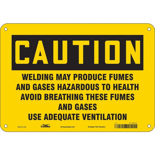 SKU G5549317Categories SafetyDescription Safety Sign, Vertical Rectangle, Number of Printed Sides 1, English, Sign Format Traditional OSHA, Sign Legend Welding May Produce Fumes And Gases Hazardous To Health Avoid Breathing These Fumes And Gases Use Adequate Ventilation, Sign Legend Background Color Yellow, Sign Legend Style Text Safety Sign, 7 in Height, 10 in Width, Aluminum, Vertical Rectangle, English, 473W43