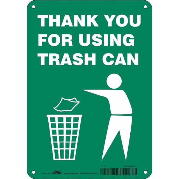 SKU G6249929Categories SafetyDescription Safety Sign, Horizontal Rectangle, Number of Printed Sides 1, English, Sign Legend Thank You For Using Trash Can, Sign Legend Background Color Green, Sign Legend Style Symbol and Text Safety Sign, 10 in Height, 7 in Width, Aluminum, Horizontal Rectangle, English, 485M63