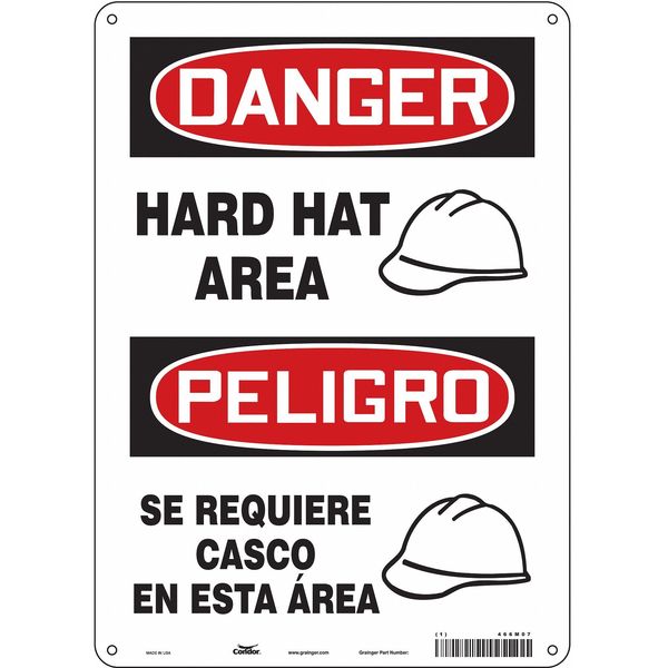 SKU G5072057Categories SafetyDescription Safety Sign, Vertical Rectangle, Number of Printed Sides 1, English, Spanish, Sign Format Traditional OSHA, Sign Legend Hard Hat Area/ Se Requiere Casco En Esta Area, Sign Legend Background Color White, Sign Legend Style Text Safety Sign, 14 in Height, 10 in Width, Aluminum, Vertical Rectangle, English, Spanish, 466M07