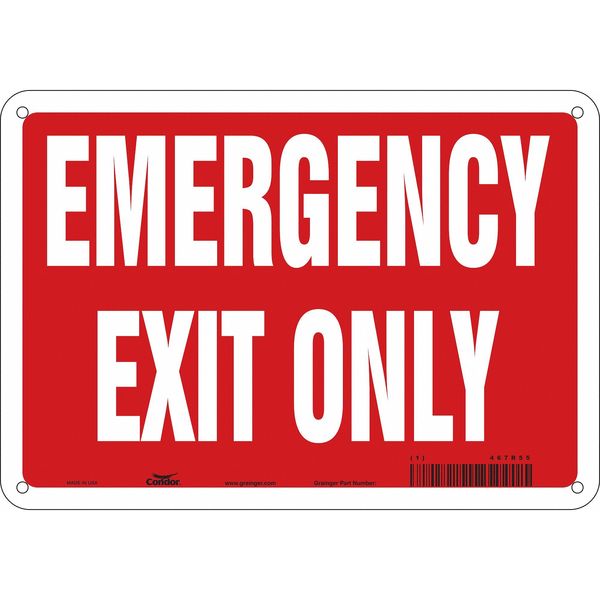 SKU G5131082Categories SafetyDescription Safety Sign Emergency Exit, Vertical Rectangle, Number of Printed Sides 1, English, Sign Legend Emergency Exit Only, Sign Legend Background Color Red, White, Sign Legend Style Text Safety Sign, 7 in x 10 in, Polyethylene