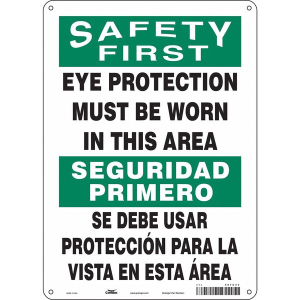 SKU G5890707Categories SafetyDescription Safety Sign, Vertical Rectangle, Number of Printed Sides 1, English, Spanish, Sign Format Traditional OSHA, Sign Legend Eye Protection Must Be Worn In This Area/Se Debe Usar Proteccion Para La Vista En Esta Area, Sign Legend Background Color White, Sign Legend Style Text Safety Sign, 10" W, 14" H, 0.032" Thickness, 467C43