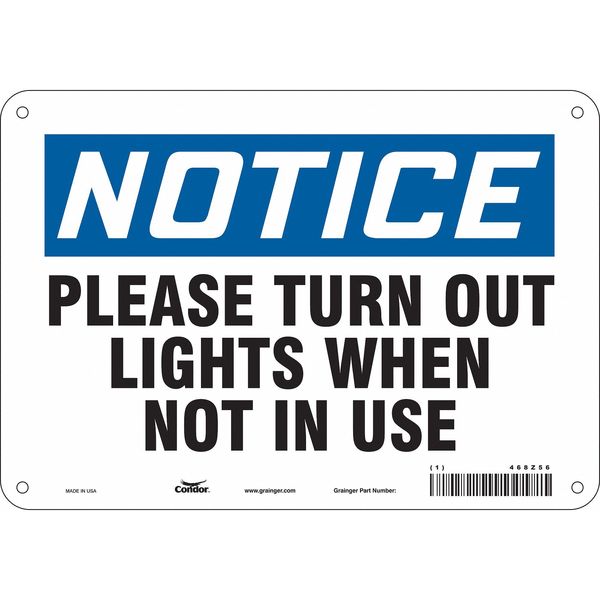 SKU G5235507Categories SafetyDescription Safety Sign, Vertical Rectangle, Number of Printed Sides 1, English, Sign Legend Please Turn Out Lights When Not In Use, Sign Legend Background Color White, Sign Legend Style Text Safety Sign, 7 in Height, 10 in Width, Aluminum, Vertical Rectangle, English, 468Z56
