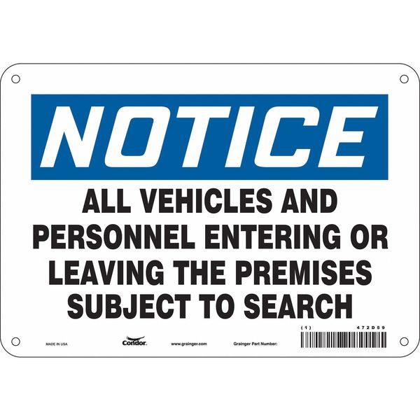 SKU G5790290Categories SafetyDescription Safety Sign, Vertical Rectangle, Number of Printed Sides 1, English, Sign Format Traditional OSHA, Sign Legend All Vehicles And Personnel Entering Or Leaving The Premises Subject To Search, Sign Legend Background Color White, Sign Legend Style Text Safety Sign, 7 in Height, 10 in Width, Aluminum, Vertical Rectangle, English, 472D59