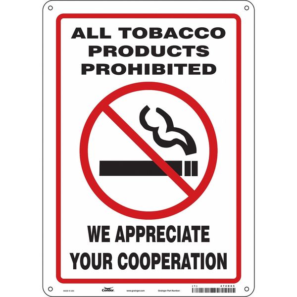 SKU G5890199Categories SafetyDescription Safety Sign, Vertical Rectangle, Number of Printed Sides 1, English, Sign Format Other Format, Sign Legend All Tobacco Products Prohibited We Appreciate Your Cooperation, Sign Legend Background Color Red, White, Sign Legend Style Symbol and Text Safety Sign, 14 in H, 10" W, Vertical Rectangle, English, 474D85