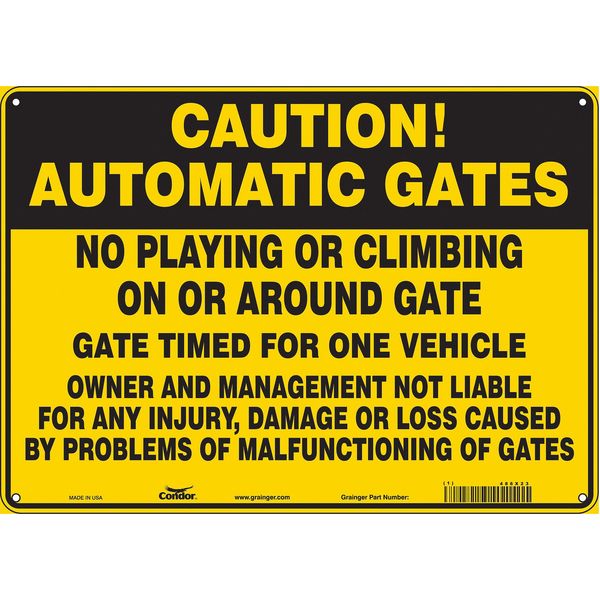 SKU G6306811Categories SafetyDescription Safety Sign, Horizontal Rectangle, Number of Printed Sides 1, English, Sign Legend Automatic Gates No Playing Or Climbing On Or Around Gate Gate Timed For One Vehicle Owner And Management Not Liable For Any Injury, Damage Or Loss Caused By Problems Of Malfunction Of Gates, Sign Legend Background Color Black, Yellow, Sign Legend Style Text Safety Sign, 10 in Height, 14 in Width, Aluminum, Horizontal Rectangle, English, 486X23