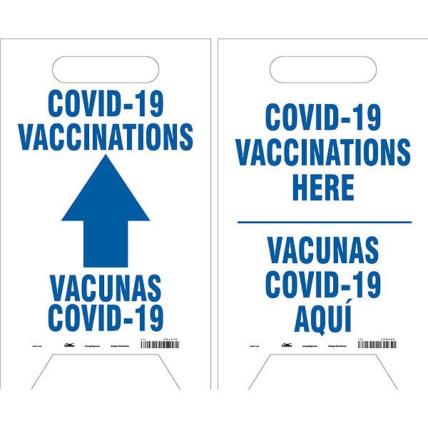 Floor Sign, 20 in H, 12 in W, Plastic, English, Spanish, 60XZ72SKU G300410872Categories SafetyDescription Floor Sign, Height 20 in, Width 12 in, Sign Material Plastic, Header No Header, Legend Covid-19 Vaccinations Vacunas Covid-19 (Up Arrow) Covid-19 Vaccinations Here Vacunas Covid-19 Aqui, Printed Language English, Spanish$35.69 / eachWeb price -