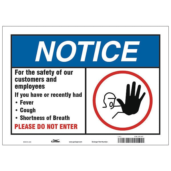 SKU G6624634Categories SafetyDescription For The Safety Of Our Customers Sign, Sign Subject Matter Coronavirus Prevention, Height 10 in, Width 14 in, Sign Material Polystyrene, Sign Mounting Style With Mounting Holes, Header Notice, Legend For The Safety Of Our Customers And Employees If You Have Or Recently Had Fever, Cough Or Shortness Of Breath Please Do Not Enter, Printed Language English$10.61 / eachWeb price