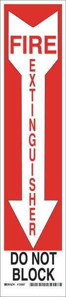Fire Ext Sign, 18X4", Black and Red/WtSKU G1212764Categories SafetyDescription Fire Extinguisher Sign, Sign Subject Matter Fire Equipment, Height 18 in, Width 4 in, Sign Material Polyester, Sign Mounting Style Adhesive Surface, Header No Header, Legend Fire Extinguisher Do Not Block, Printed Language English, Sign Shape Rectangle$14.81 / eachWeb price -