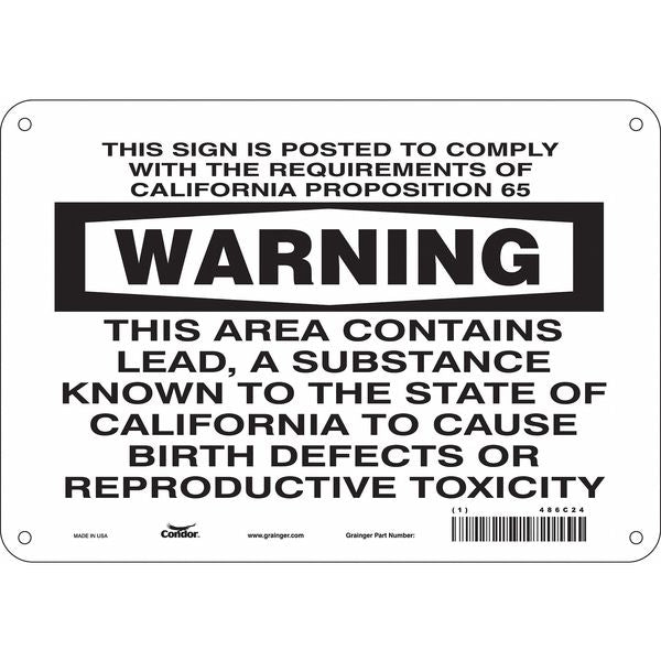 Chemical Sign, 7 in H, 10 in W, Vertical Rectangle, English, 486C24SKU G6319953Categories SafetyDescription Chemical Sign, Vertical Rectangle, Number of Printed Sides 1, English, Sign Format Other Format, Sign Legend This Sign Is Posted To Comply With The Requirements Of California Proposition 65 This Area Contains Lead, A Substance Known To The State Of California To Cause Birth Defects Or Reproductive Toxicity, Sign Legend Background Color White, Sign Legend Style TextgraingerSKU: 486C24, mscSKU: , zoro_no: G6319953, mongo_id: 65bbe78f9a749db822742528