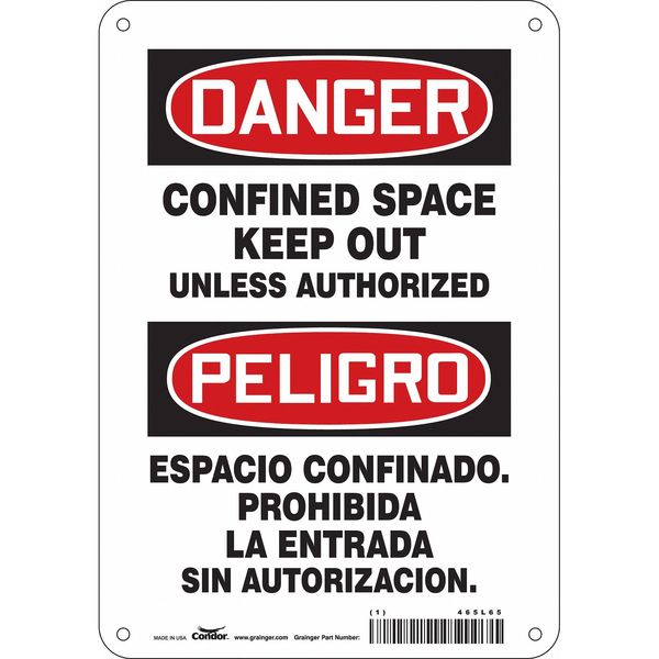 Safety Sign, 10 in Height, 7 in Width, Aluminum, Horizontal Rectangle, English, Spanish, 465L65SKU G5077779Categories SafetyDescription Safety Sign, Horizontal Rectangle, Number of Printed Sides 1, English, Spanish, Sign Format Traditional OSHA, Sign Legend Confined Space Keep Out Unless Authorized/Espacio Confinado. Prohibida La Entrada Sin Autorizacion., Sign Legend Background Color White, Sign Legend Style TextgraingerSKU: 465L65, mscSKU: , zoro_no: G5077779, mongo_id: 65bbe78f9a749db8227424bc