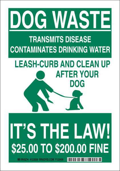SKU G8473348Categories SafetyDescription Recycle Sign, Sign Subject Matter Pets, Height 14 In., Width 10 In., Sign Material Aluminum, Sign Mounting Style With Mounting Holes, Header Dog Waste, Legend Transmits Disease Contaminates Drinking Water Leash-Curb And Clean Up After Your Dog Its The Law 25.00 To 200.00 Fine, Printed Language English, Sign Shape Rectangle$32.49 / eachWeb price