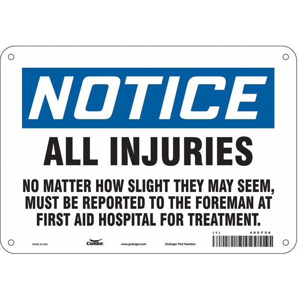 SKU G6270807Categories SafetyDescription Safety Sign, Vertical Rectangle, Number of Printed Sides 1, English, Sign Format Traditional OSHA, Sign Legend All Injures No Matter How Slight They May Seem Must Be Reported To The Foreman At First Aid Hospital For Treatment, Sign Legend Background Color White, Sign Legend Style TextgraingerSKU: 485Y56, mscSKU: , zoro_no: G6270807, mongo_id: 65bbe7649a749db8227341ba