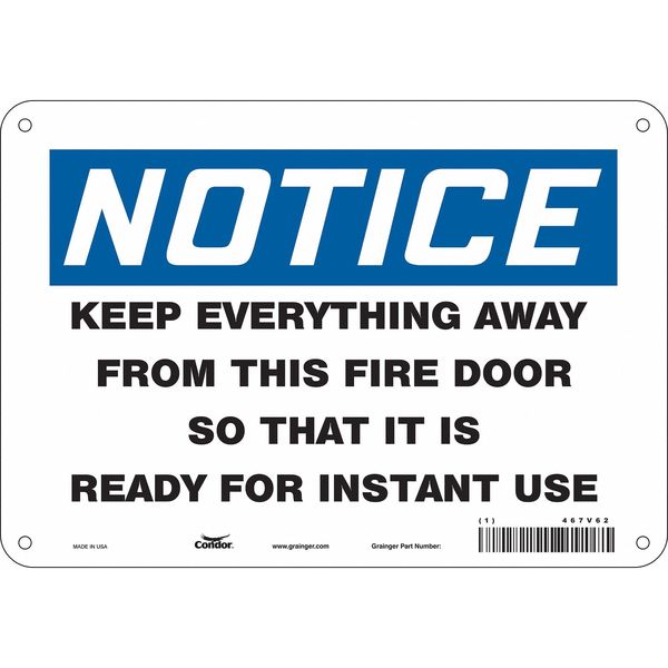 SKU G5600207Categories SafetyDescription Safety Sign Emergency Exit, Vertical Rectangle, Number of Printed Sides 1, English, Sign Format Traditional OSHA, Sign Legend Keep Everything Away From This Fire Door So That It Is Ready For Instant Use, Sign Legend Background Color White, Sign Legend Style TextgraingerSKU: 467V62, mscSKU: , zoro_no: G5600207, mongo_id: 65bbe7649a749db82273409f
