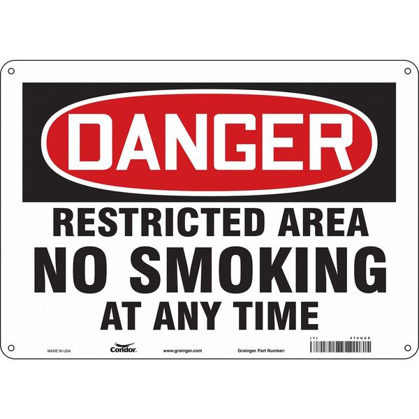SKU G5902062Categories SafetyDescription Safety Sign, Horizontal Rectangle, Number of Printed Sides 1, English, Sign Format Traditional OSHA, Sign Legend Restricted Area No Smoking At Any Time, Sign Legend Background Color White, Sign Legend Style TextgraingerSKU: 474U68, mscSKU: , zoro_no: G5902062, mongo_id: 65bbe7649a749db82273404e