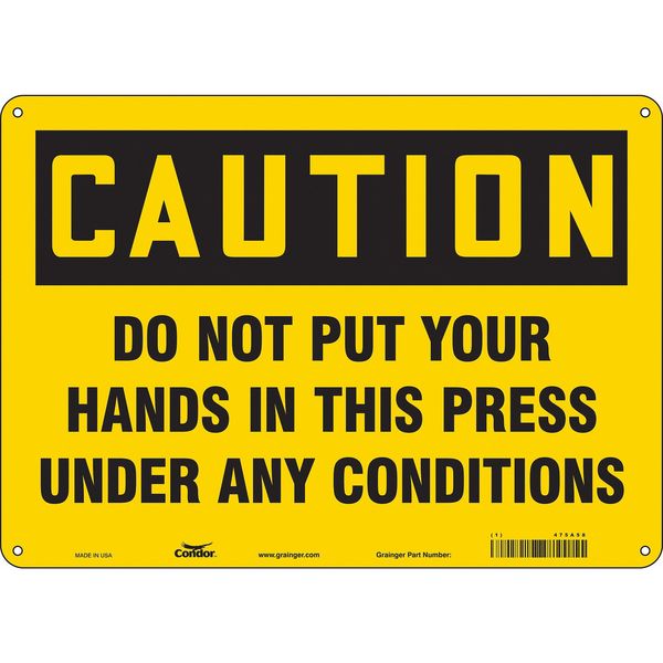 Safety Sign, 10 in Height, 14 in Width, Aluminum, Horizontal Rectangle, English, 475A58SKU G5265607Categories SafetyDescription Safety Sign, Horizontal Rectangle, Number of Printed Sides 1, English, Sign Format Traditional OSHA, Sign Legend Do Not Put Your Hands In This Press Under Any Conditions, Sign Legend Background Color Yellow, Sign Legend Style TextgraingerSKU: 475A58, mscSKU: , zoro_no: G5265607, mongo_id: 65bbe7649a749db822733f8e