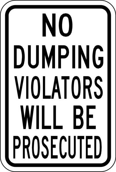 SKU G0212475Categories SafetyDescription Traffic Sign, Vertical Rectangle, Number of Printed Sides 1, English, Sign Legend No Dumping Violators Will Be Prosecuted, Sign Legend Background Color White, Sign Legend Style TextgraingerSKU: 3PMG1, mscSKU: , zoro_no: G0212475, mongo_id: 65bbe7649a749db822733d0e