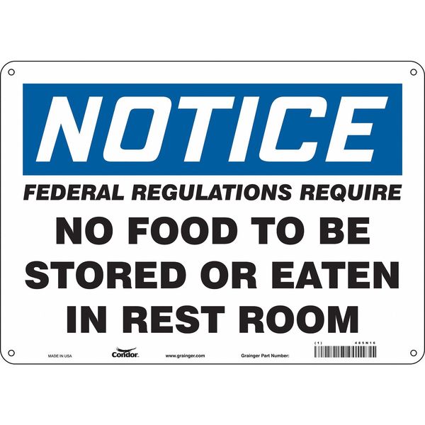 Safety Sign, 10 in Height, 14 in Width, Aluminum, Horizontal Rectangle, English, 485N16SKU G6297687Categories SafetyDescription Safety Sign, Horizontal Rectangle, Number of Printed Sides 1, English, Sign Format Traditional OSHA, Sign Legend Federal Regulations Require No Food To Be Stored Or Eaten In Rest Room, Sign Legend Background Color White, Sign Legend Style TextgraingerSKU: 485N16, mscSKU: , zoro_no: G6297687, mongo_id: 65bbe7649a749db822733f65