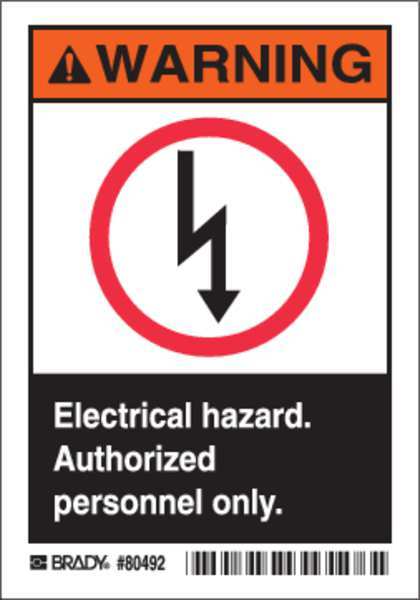 Warning Sign, Poly., 5X3-1/2, PK5SKU G7386832Categories SafetyDescription Warning Sign, Sign Subject Matter Electrical Hazard, Height 3 1/2 in, Width 5 in, Sign Material Polyester, Sign Mounting Style Adhesive Surface, Header Warning, Legend Electrical Hazard. Authorized Personnel Only., Printed Language English, Sign Shape Rectangle, Package Quantity 5$20.61 / eachWeb price -