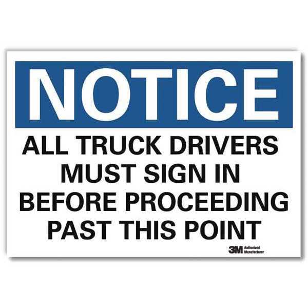 Notice Sign, 5 in H, 7 in W, Reflective Sheeting, Horizontal Rectangle, English, U5-1056-RD_7X5SKU G2765047Categories SafetyDescription Notice Sign, Horizontal Rectangle, Number of Printed Sides 1, English, Sign Format Traditional OSHA, Sign Legend All Truck Drivers Must Sign In Before Proceeding Past This Point, Sign Legend Background Color White, Sign Legend Style TextgraingerSKU: 34JH65, mscSKU: , zoro_no: G2765047, mongo_id: 65bbe7649a749db822733c63
