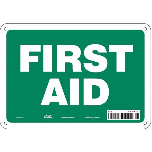 SKU G5059420Categories SafetyDescription First Aid Sign, Vertical Rectangle, Number of Printed Sides 1, English, Sign Format Other Format, Sign Legend First Aid, Sign Legend Background Color Green, Sign Legend Style TextgraingerSKU: 471U33, mscSKU: , zoro_no: G5059420, mongo_id: 65bbe7463aaddbd5a9085429