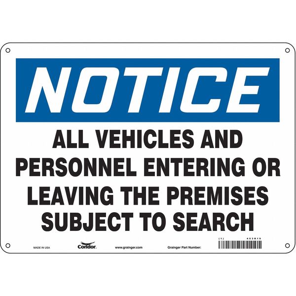 SKU G5062710Categories SafetyDescription Security Sign, Horizontal Rectangle, Number of Printed Sides 1, English, Sign Format Traditional OSHA, Sign Legend All Vehicles And Personnel Entering Or Leaving The Premises Subject To Search, Sign Legend Background Color White, Sign Legend Style TextgraingerSKU: 453R19, mscSKU: , zoro_no: G5062710, mongo_id: 65bbe7463aaddbd5a9085332