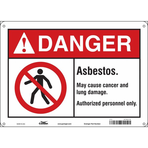 Safety Sign, 10 in Height, 14 in Width, Aluminum, Horizontal Rectangle, English, 479L14SKU G5816872Categories SafetyDescription Safety Sign, Horizontal Rectangle, Number of Printed Sides 1, English, Sign Format ANSI/OSHA Format, Sign Legend Asbestos. May Cause Cancer And Lung Damage. Authorized Personnel Only., Sign Legend Background Color White, Sign Legend Style Symbol and TextgraingerSKU: 479L14, mscSKU: , zoro_no: G5816872, mongo_id: 65bbe7463aaddbd5a90853ca