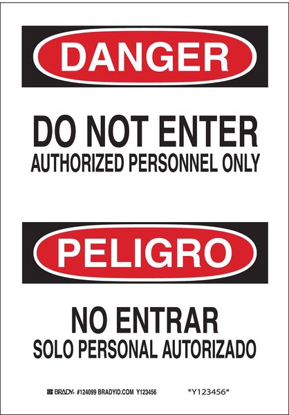 SKU G8479891Categories SafetyDescription Danger Sign, Sign Subject Matter Authorized Personnel and Restricted Access, Height 14 in, Width 10 in, Sign Material Aluminum, Sign Mounting Style With Mounting Holes, Header Danger/Peligro, Legend Do Not Enter Authorized Personnel Only/No Entre Solo Personal Autorizado, Printed Language English, Spanish, Sign Shape Rectangle$32.11 / eachWeb priceDanger Sign, 14X10", R and BK/WHT, Text, Standards: ASTM D 1593SKU G8479891Categories SafetyDescription Danger Sign, Sign Subject Matter Authorized Personnel and Restricted Access, Height 14 in, Width 10 in, Sign Material Aluminum, Sign Mounting Style With Mounting Holes, Header Danger/Peligro, Legend Do Not Enter Authorized Personnel Only/No Entre Solo Personal Autorizado, Printed Language English, Spanish, Sign Shape Rectangle$32.11 / eachWeb price -