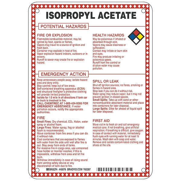 SKU G5621987Categories SafetyDescription Chemical Sign, Isopropyl Acetate Potential Hazards, Fiberglass, Height 10 in, Width 7 in, Header No Header, Legend Style Symbol and Text, Language English, Mounting Style Surface, Thickness 0.1 in, Sign Shape Rectangle, Operating Temp. Range -40 Degrees to 194 Degrees F, Retroreflective Grade Not RetroreflectivegraingerSKU: 41F487, mscSKU: , zoro_no: G5621987, mongo_id: 65bbee3c526e052139afb835