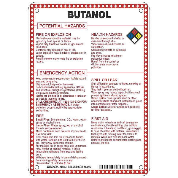 SKU G5492164Categories SafetyDescription Chemical Sign, Butanol Potential Hazards, Fiberglass, Height 10 in, Width 7 in, Header No Header, Legend Style Symbol and Text, Language English, Mounting Style Surface, Thickness 0.1 in, Sign Shape Rectangle, Operating Temp. Range -40 Degrees to 194 Degrees F, Retroreflective Grade Not RetroreflectivegraingerSKU: 41F462, mscSKU: , zoro_no: G5492164, mongo_id: 65bbea6522d7a989a99b1044