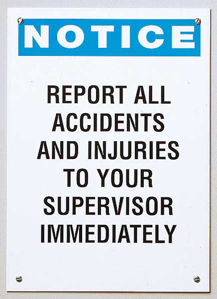 SKU G4907786Categories SafetyDescription Notice Sign, Report All Accidents And Injuries To Your Supervisor Immediately, Acrylic, Height 14 in, Width 10 in, Header Notice, Legend Style Text, Language English, Mounting Style With Mounting Holes, Thickness 0.06 in, Sign Shape Rectangle, Operating Temp. Range -40 Degrees to 176 Degrees F, Retroreflective Grade Not RetroreflectivegraingerSKU: 8ZFL6, mscSKU: , zoro_no: G4907786, mongo_id: 65bbee3c526e052139afb936