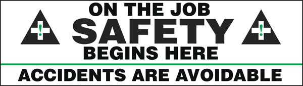 SKU G8444414Categories SafetyDescription Safety Banner, Shape Horizontal Rectangle, Safety Banner Legend On The Job Safety Begins Here Accidents Are Avoidable, Sign Legend Style Symbol and Text, Printed Language English, Background Color White, Number of Printed Sides 1, Width 96 in, Height 28 in, Thickness 0.013 ingraingerSKU: 9MME1, mscSKU: , zoro_no: G8444414, mongo_id: 65bbee3c526e052139afb990