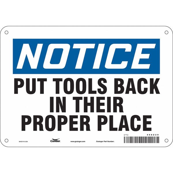 Safety Sign, 7 in Height, 10 in Width, Aluminum, Vertical Rectangle, English, 468Z29SKU G5222353Categories SafetyDescription Safety Sign, Vertical Rectangle, Number of Printed Sides 1, English, Sign Legend Put Tools Back In Their Proper Place, Sign Legend Background Color White, Sign Legend Style TextgraingerSKU: 468Z29, mscSKU: , zoro_no: G5222353, mongo_id: 65bbee2b526e052139af30a1