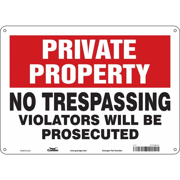 Safety Sign, 10 in Height, 14 in Width, Aluminum, Horizontal Rectangle, English, 473M24SKU G5533013Categories SafetyDescription Safety Sign, Horizontal Rectangle, Number of Printed Sides 1, English, Sign Format Other Format, Sign Legend No Trespassing Violators Will Be Prosecuted, Sign Legend Background Color Red, White, Sign Legend Style TextgraingerSKU: 473M24, mscSKU: , zoro_no: G5533013, mongo_id: 65bbee2b526e052139af306a