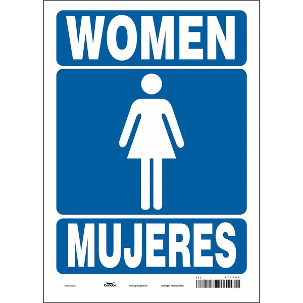Restroom Sign, 10" W, 14" H, 0.004" Thick, 473Y93SKU G5644103Categories SafetyDescription Restroom Sign, Vertical Rectangle, Number of Printed Sides 1, English, Spanish, Sign Legend Women/Mujeres, Sign Legend Background Color Blue, Sign Legend Style Symbol and TextgraingerSKU: 473Y93, mscSKU: , zoro_no: G5644103, mongo_id: 65bbee2b526e052139af3098