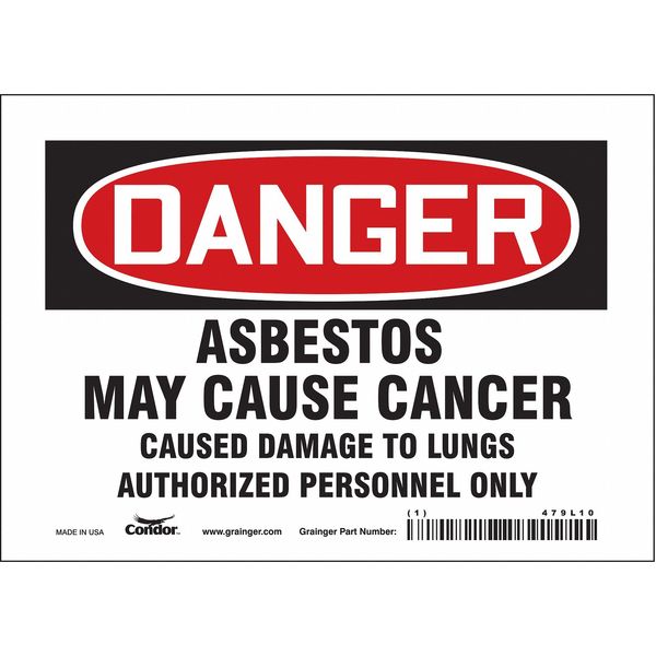 Safety Sign, 5 in Height, 7 in Width, Vinyl, Horizontal Rectangle, English, 479L10SKU G5640947Categories SafetyDescription Safety Sign, Horizontal Rectangle, Number of Printed Sides 1, English, Sign Format Traditional OSHA, Sign Legend Asbestos May Cause Cancer Causes Damage To Lungs Authorized Personnel Only, Sign Legend Background Color White, Sign Legend Style TextgraingerSKU: 479L10, mscSKU: , zoro_no: G5640947, mongo_id: 65bbee2b526e052139af2fc2
