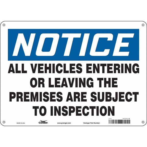 SKU G5869077Categories SafetyDescription Traffic Sign, Horizontal Rectangle, Number of Printed Sides 1, English, Sign Format Traditional OSHA, Sign Legend All Vehicles Entering Or Leaving The Premises Are Subject To Inspection, Sign Legend Background Color White, Sign Legend Style TextgraingerSKU: 477V10, mscSKU: , zoro_no: G5869077, mongo_id: 65bbee2b526e052139af2f3a