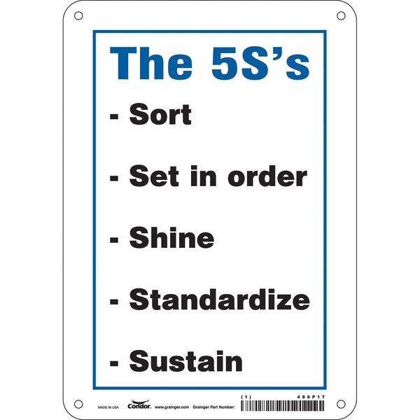 Safety Sign, 10 in Height, 7 in Width, Aluminum, Horizontal Rectangle, English, 486P17SKU G6267812Categories SafetyDescription Safety Sign, Horizontal Rectangle, Number of Printed Sides 1, English, Sign Format Other Format, Sign Legend The 5S'S Sort Set In Order Shine Standardize Sustain, Sign Legend Background Color White, Sign Legend Style TextgraingerSKU: 486P17, mscSKU: , zoro_no: G6267812, mongo_id: 65bbee2b526e052139af2e97