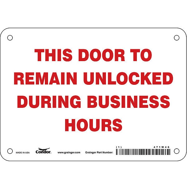 SKU G5518289Categories SafetyDescription Safety Sign, Horizontal Rectangle, Number of Printed Sides 1, English, Sign Legend This Door To Remain Unlocked During Business Hours, Sign Legend Background Color White, Sign Legend Style TextgraingerSKU: 471W46, mscSKU: , zoro_no: G5518289, mongo_id: 65bbee06526e052139ae4a4c
