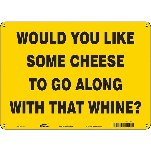 Safety Sign, 10 in Height, 14 in Width, Aluminum, Horizontal Rectangle, English, 486P03SKU G6246499Categories SafetyDescription Safety Sign, Horizontal Rectangle, Number of Printed Sides 1, English, Sign Format Other Format, Sign Legend Would You Like Some Cheese To Go Along With That Whine?, Sign Legend Background Color Yellow, Sign Legend Style TextgraingerSKU: 486P03, mscSKU: , zoro_no: G6246499, mongo_id: 65bbee06526e052139ae4b3d
