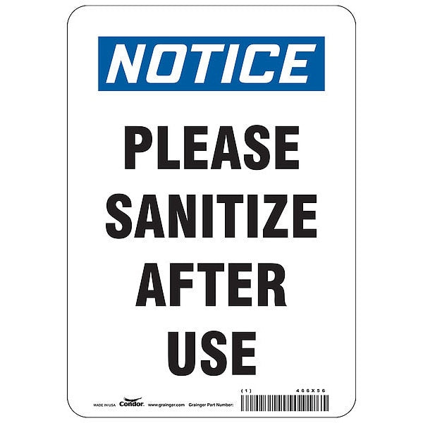 Please Sanitize After Use Sign, 7" W x 10" H, English, AluminumSKU G8513995Categories SafetyDescription Please Sanitize After Use Sign, Sign Subject Matter Coronavirus Prevention, Height 10 in, Width 7 in, Sign Material Aluminum, Sign Mounting Style With Mounting Holes, Header Notice, Legend Please Sanitize After Use, Printed Language English, Sign Shape Rectangle$16.61 / eachWeb price -
